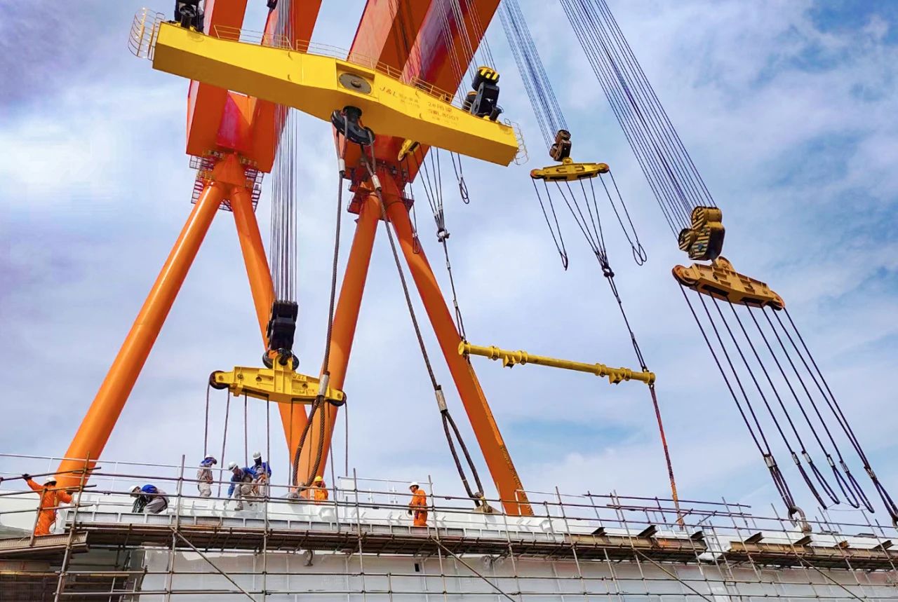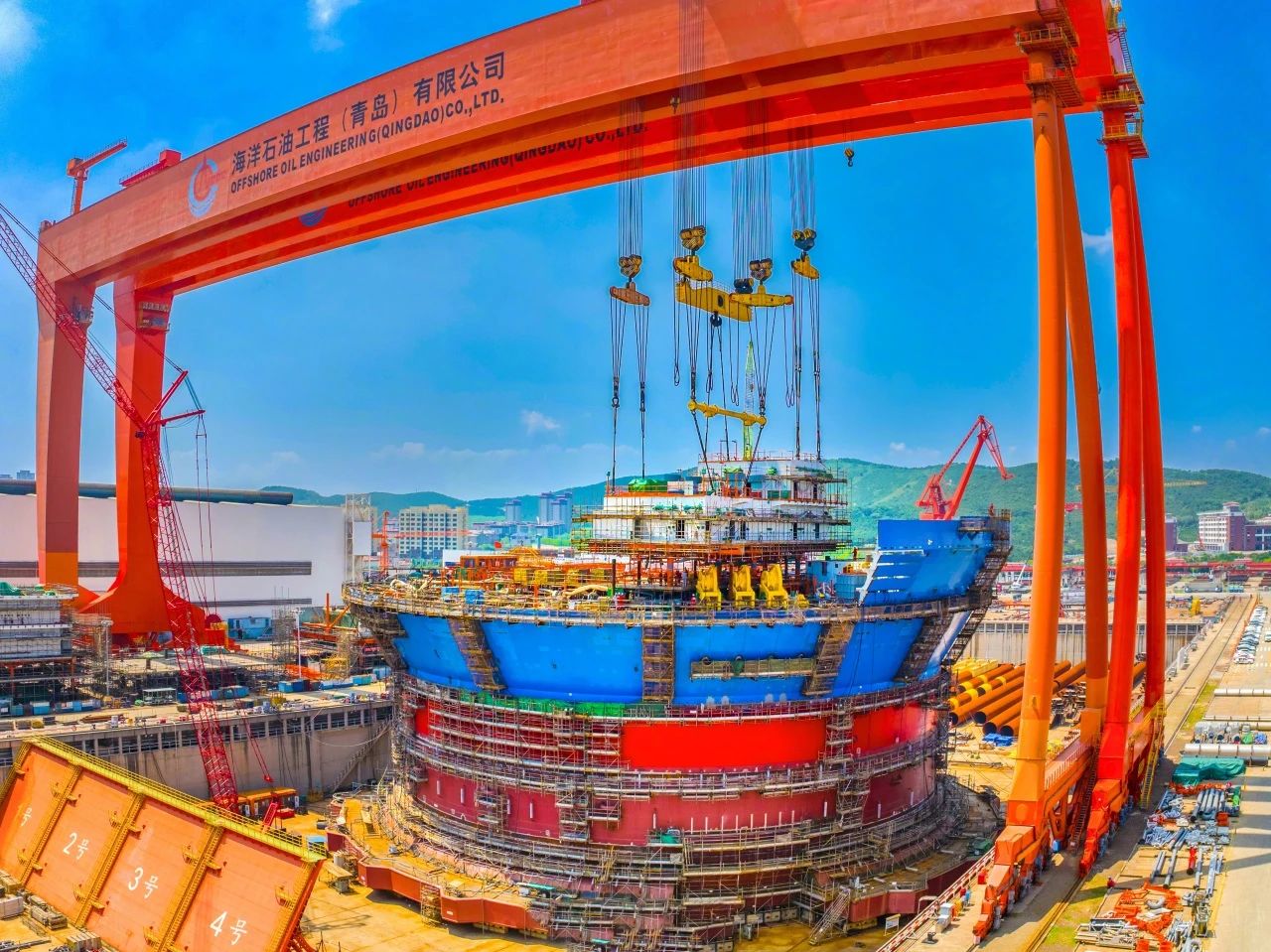 2023年12月,由我國(guó)自主設(shè)計(jì)建造的亞洲首艘圓筒型“海上油氣加工廠”“海洋石油122”浮式生產(chǎn)儲(chǔ)卸油裝置——“海葵一號(hào)”超級(jí)能源碗在青島完成主體建造,巨力索具提供800噸吊梁、400噸、500噸吊排及配套索具組成成套吊裝系統(tǒng),全程配合吊裝順利進(jìn)行。