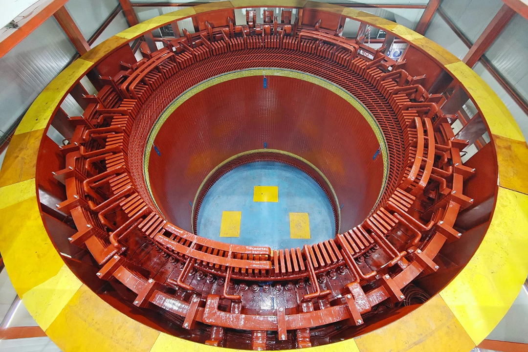 浙江天臺(tái)抽蓄電站是國(guó)內(nèi)在建單機(jī)容量最大、全球水頭最高的抽蓄電站,其2號(hào)機(jī)定子堪稱電站核心設(shè)備中的“巨無(wú)霸”。定子外徑約8.1米,由15萬(wàn)余張硅鋼片精密疊裝而成,整體起吊重量約482.7噸,是該電站開工以來(lái)吊裝的第三臺(tái)具有毫米級(jí)定位精度的超大單體設(shè)備。