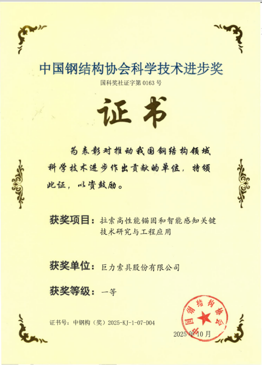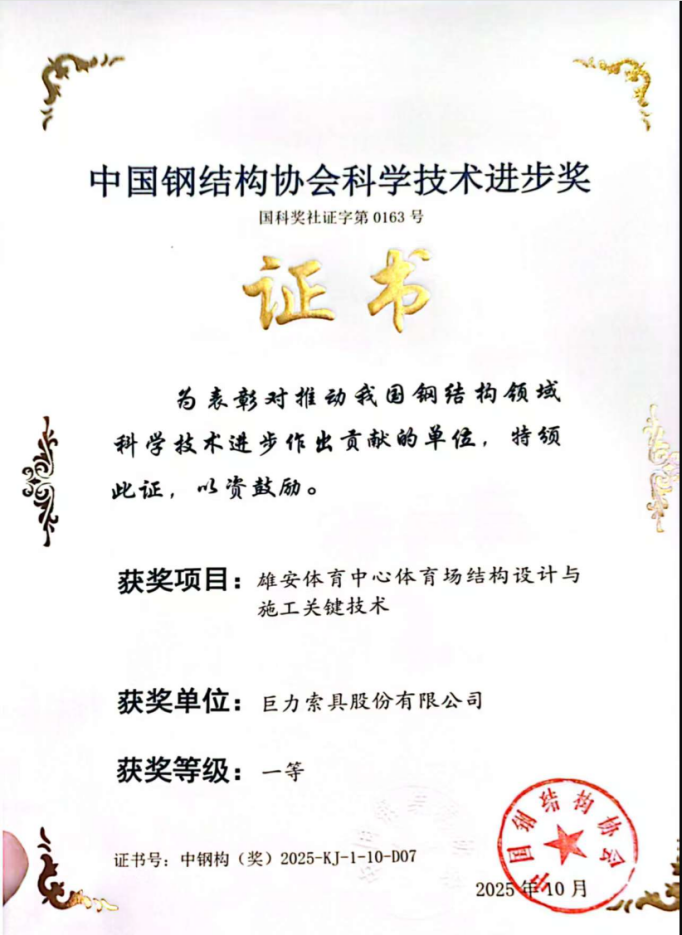 近日,2025年度中國鋼結構協會科學技術進步獎評審結果揭曉。在10月14日于廣西南寧舉行的頒獎典禮上,巨力索具股份有限公司憑借卓越的技術研發實力,一舉斬獲三項一等獎,充分彰顯了公司在高端索具技術領域的創新引領地位。