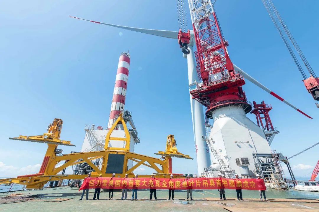 近日,汕頭某海域,巨力索具研發(fā)的國內首臺50噸大兆瓦全角度旋轉式海上單葉片吊具,剛剛面世,便展開連續(xù)作業(yè),順利完成5臺風機的葉片吊裝,經受住了考驗,完美的展示了巨力吊具的高可靠性、高安全性及高效率。