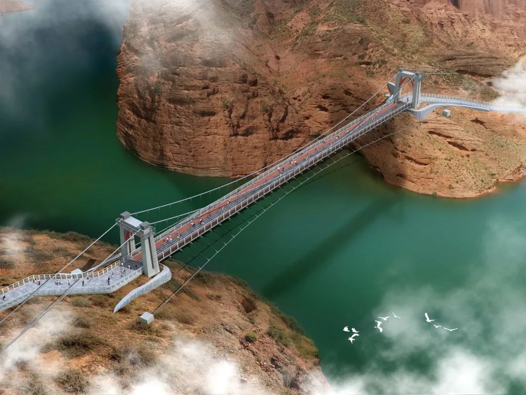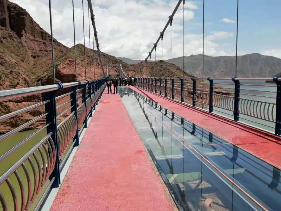 青??膊祭皡^人行懸索橋全程跨度110米,橋梁寬6米,人行道凈寬5米。大橋位于李家峽水庫入口附近,橋梁連接水庫入口兩岸,兩端連接旅游人行棧道,坎布拉丹霞地貌多以奇峰、峭壁為其主要地貌特征,生態環境脆弱,大橋兩岸地勢陡峭,工程地質條件極為復雜,對產品要求極高。