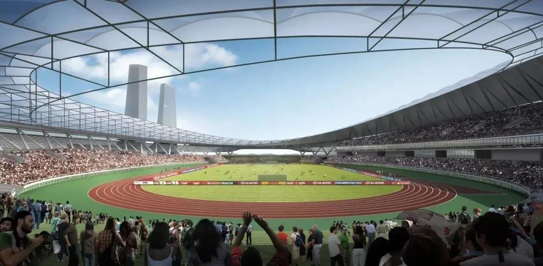 呼應體育場不對稱的屋面形態,