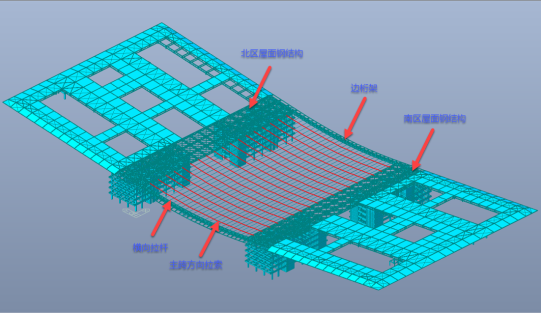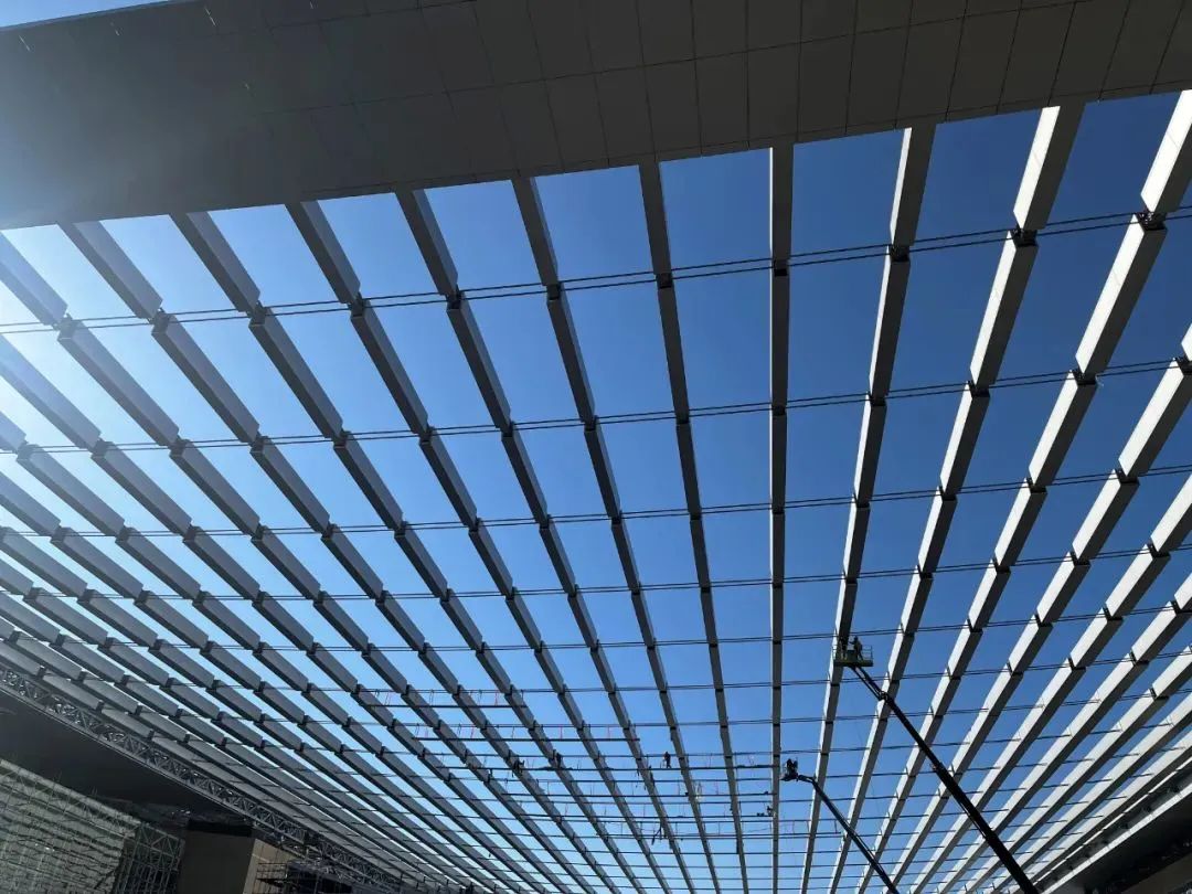 就拿高難度的拉索安裝來說,矢高約3.5米的超大弧形懸索鋼屋蓋,每榀桁架起吊后,需要找到最適宜的角度做成傾斜狀態。其中最長的桁架,連續跨度可達120米左右。大屋面由“雙向鋼桁架+跨中拉索結構”組成,中央區域110米全懸空的懸鏈態由兩側邊桁架及中間36根直徑為70毫米的不銹鋼拉索組成,施工牽引張拉、精度、溫度、雙索的扭曲偏轉是無可回避的難題。